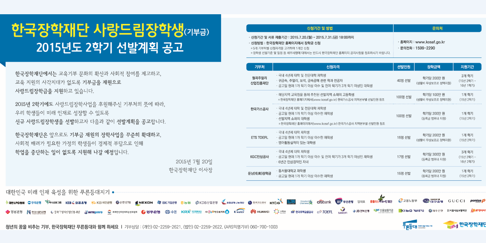 [한국장학재단] 2015년 2학기 사랑드림장학금(신규) 신청 안내